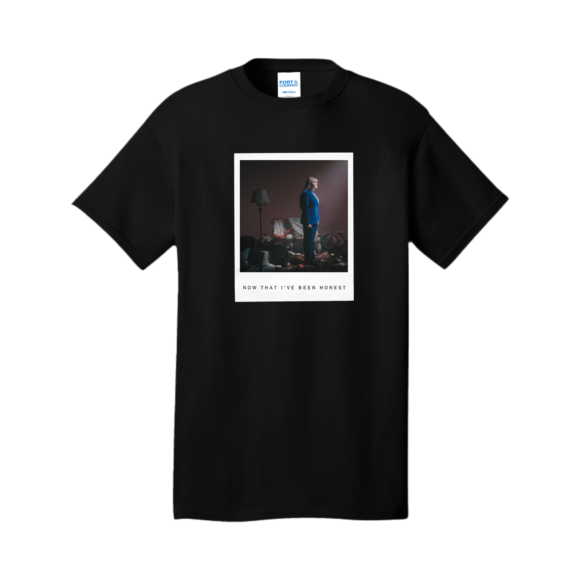 Premium unisex black t-shirt featuring the Now That I’ve Been Honest Polaroid photo on the front.